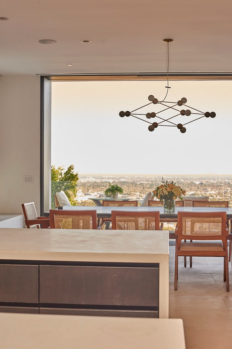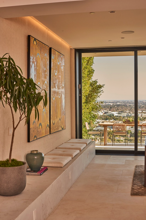 Located in the Hollywood Hills, the Granito project offers a contemporary and timeless design that reflects a chic LA lifestyle. The finishes of the home are influenced by Mediterranean tradition; we utilized custom zellige mosaics, bold patterned tiles & wallpaper, and unique architectural elements to provide efficiency and visual interest. The use of mixed materials such as stained wood, natural stone, mixed metals and glass creates depth and texture as natural daylight floods each area of the home due to the custom floor to ceiling glass windows + doors that open up to spectacular city views. The selected furnishings & accessories of the home bring about an upscale rockstar vibe that reveals artistic expression & refined elegance. Photography by Higgsey Photography & Interior Design with Lucy Loneragan Design